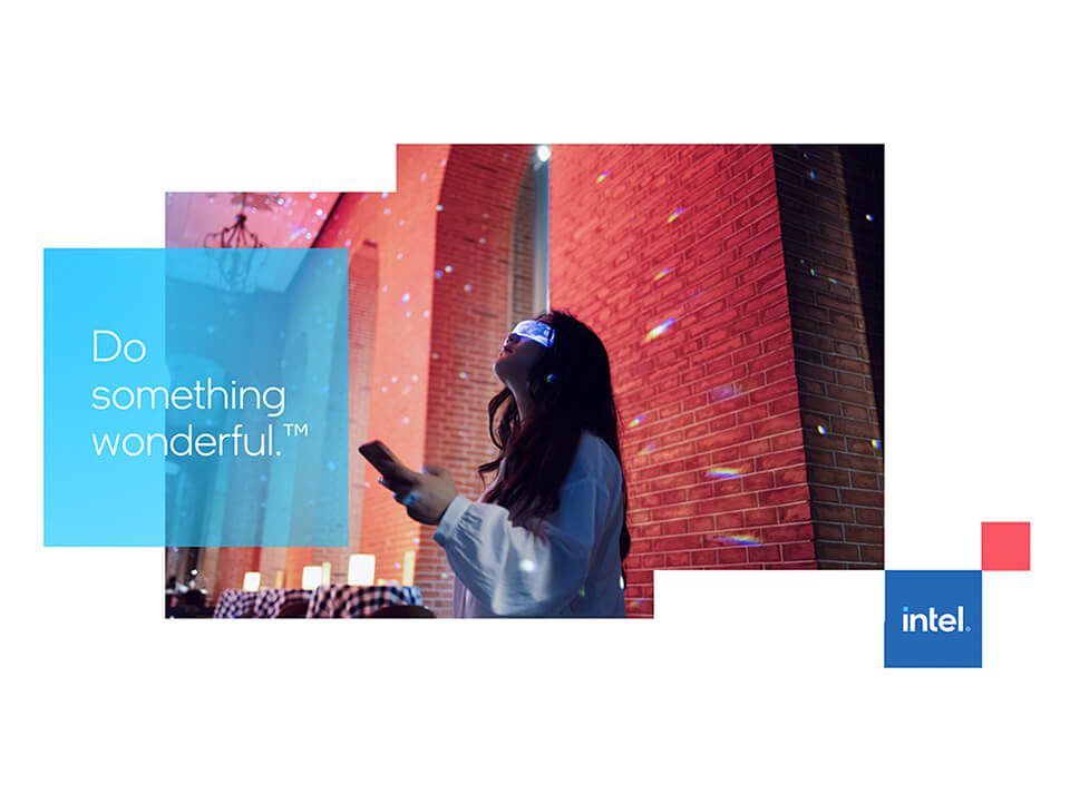 Person with virtual reality eyewear and text that says "Do something wonderful. Intel"