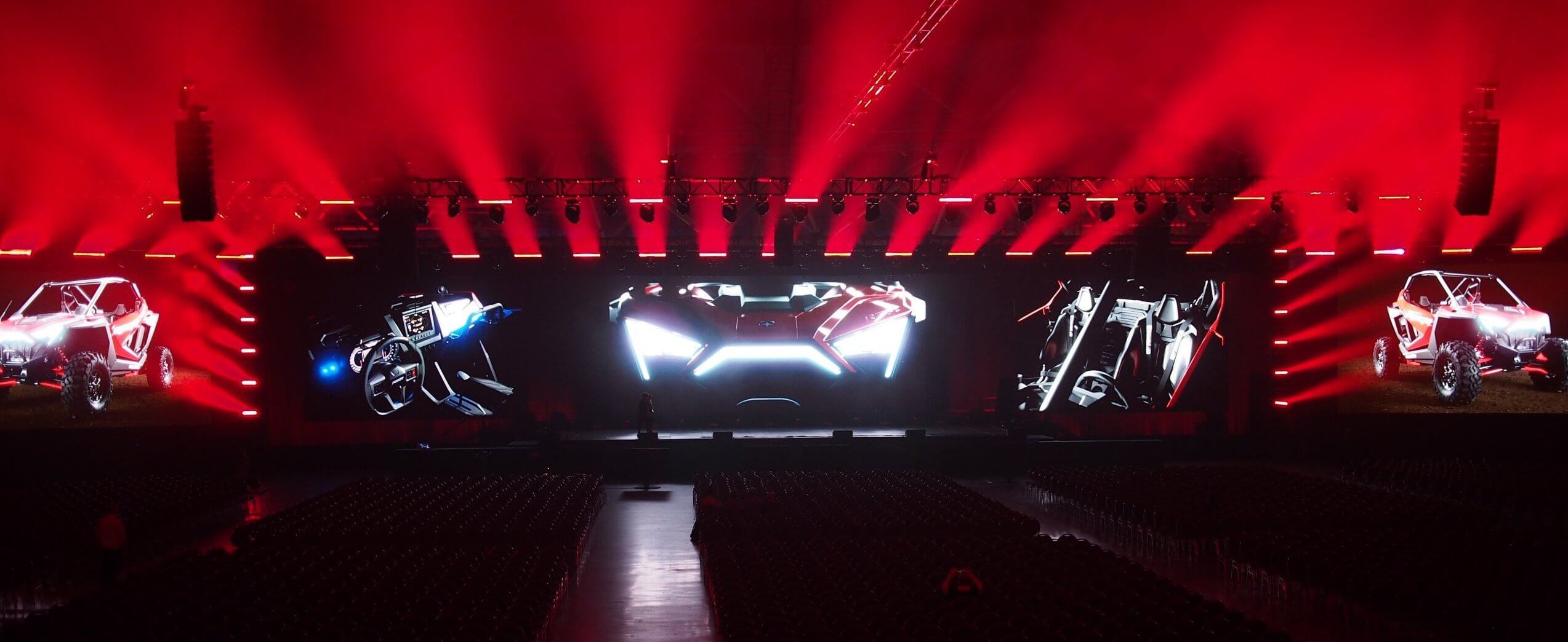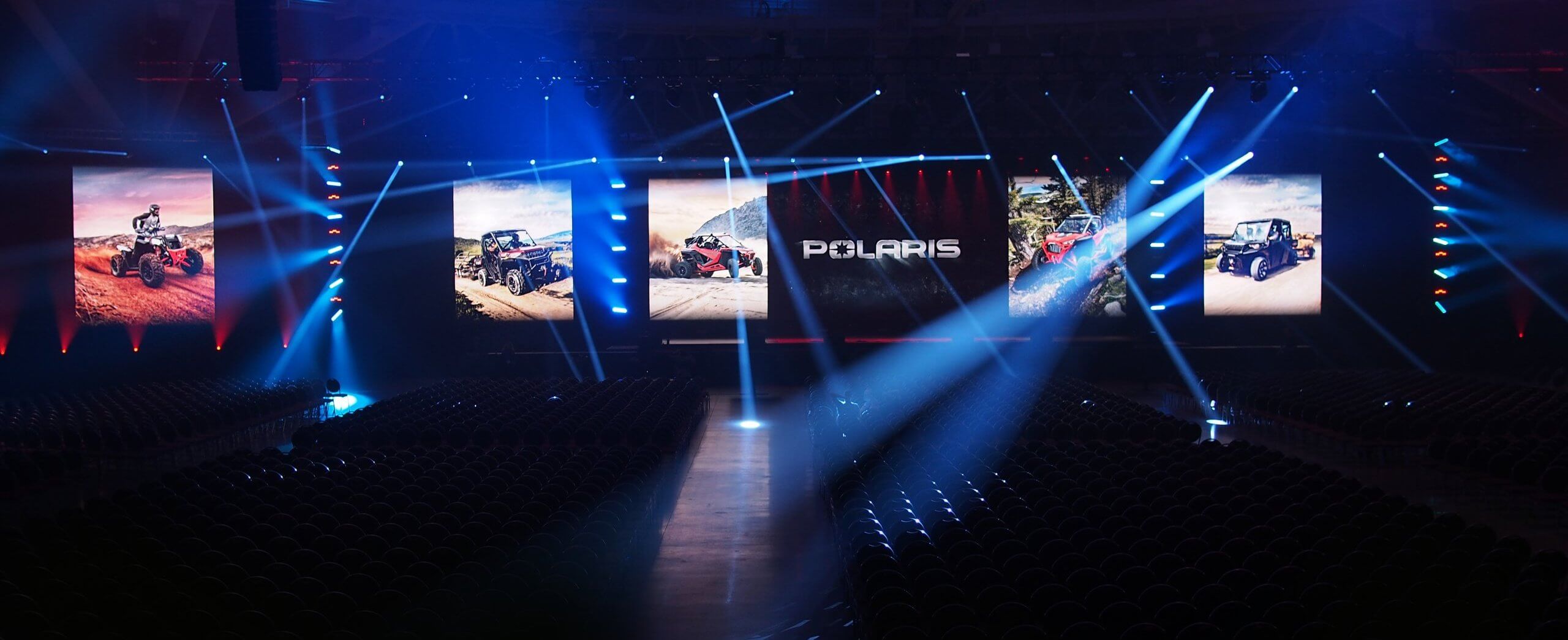 For Polaris’ 65th Anniversary, we leveraged the element of surprise—a massive moving LED screen that ebbed and flowed with content telling stories of the company’s five largest brands. A large, pixel-mapped lighting rig amplified the visual impact of their message and provided touring level support to musical headliners. We also supported the divisional business meetings, new product garages, a 150,000 sq. ft. display room, a custom-made demo track, and a facility tour at the company’s R&D headquarters.